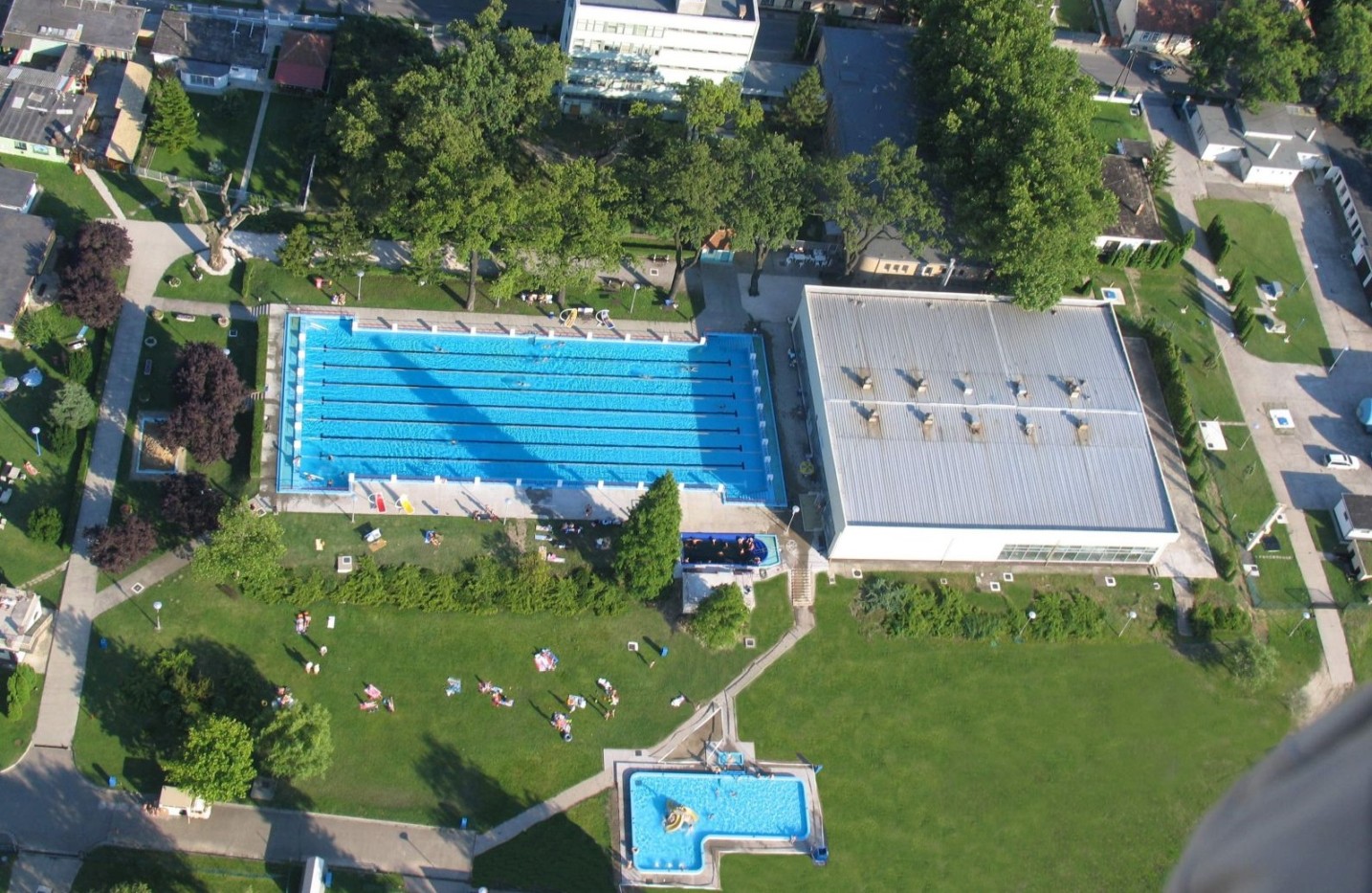 Ein Bad für alle Generationen. Die Sportfreunde können das innere und äußere Schwimmbecken benutzen. Die Thermalbecken befinden sich in der Halle und im Freien.